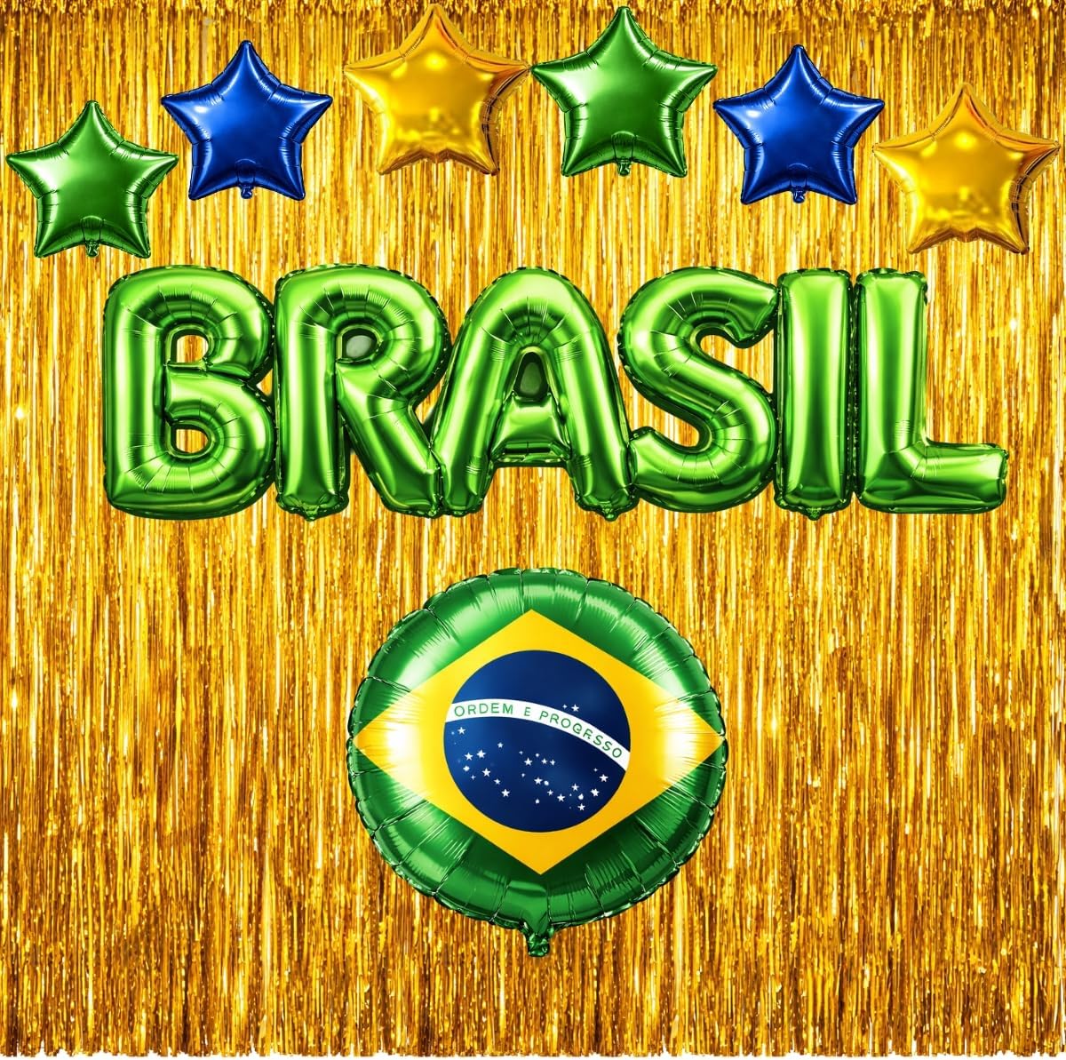 Kit Decoração Futebol Brasil Copa do Mundo – Cortinas Metalizadas + Balões Brasil + Estrelas | Festa Futebol e Torcida Verde e Amarelo