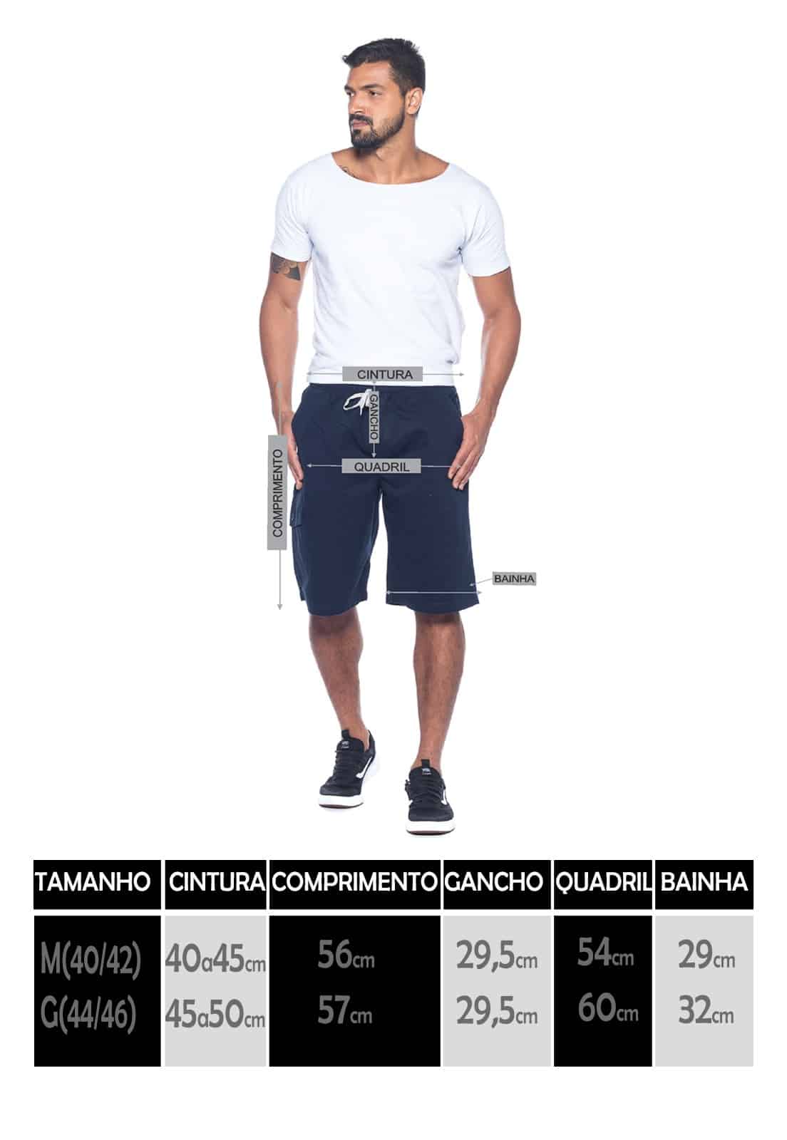 tamanho M (40 a 42): cintura 40 a 45 cm; comprimento 56 cm; gancho 29,50 cm; quadril 54 cm; bainha 29 cm.