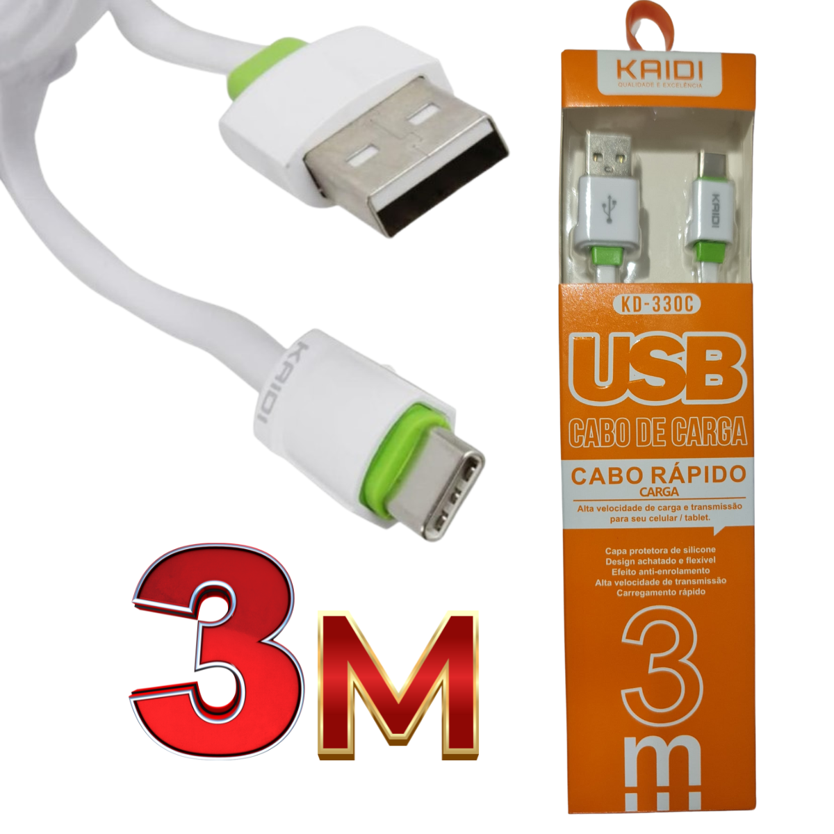 Itens na Caixa: 1 Cabo de Carga USB Kaidi KD-330C 3 Metros