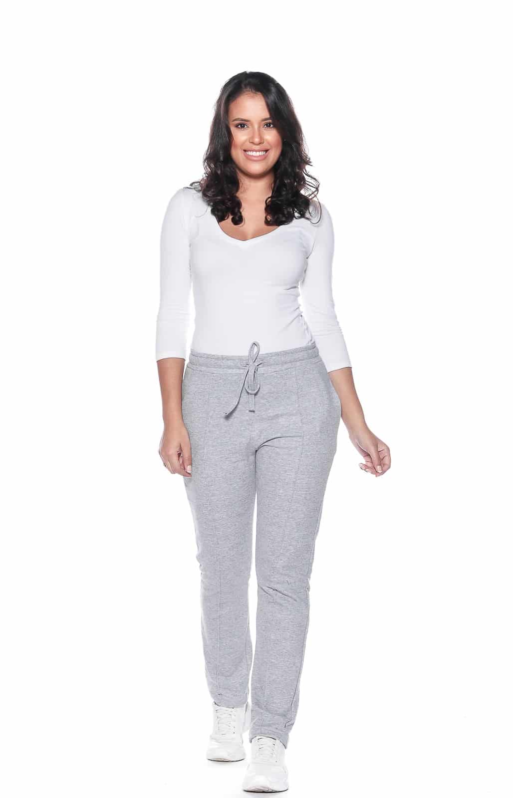 A composição do tecido usado na confecção dessa calça mistura fibras de algodão, que permite tingirmos em qualquer cor e garante toque macio, e o elastano, que dá mobilidade e conforto.