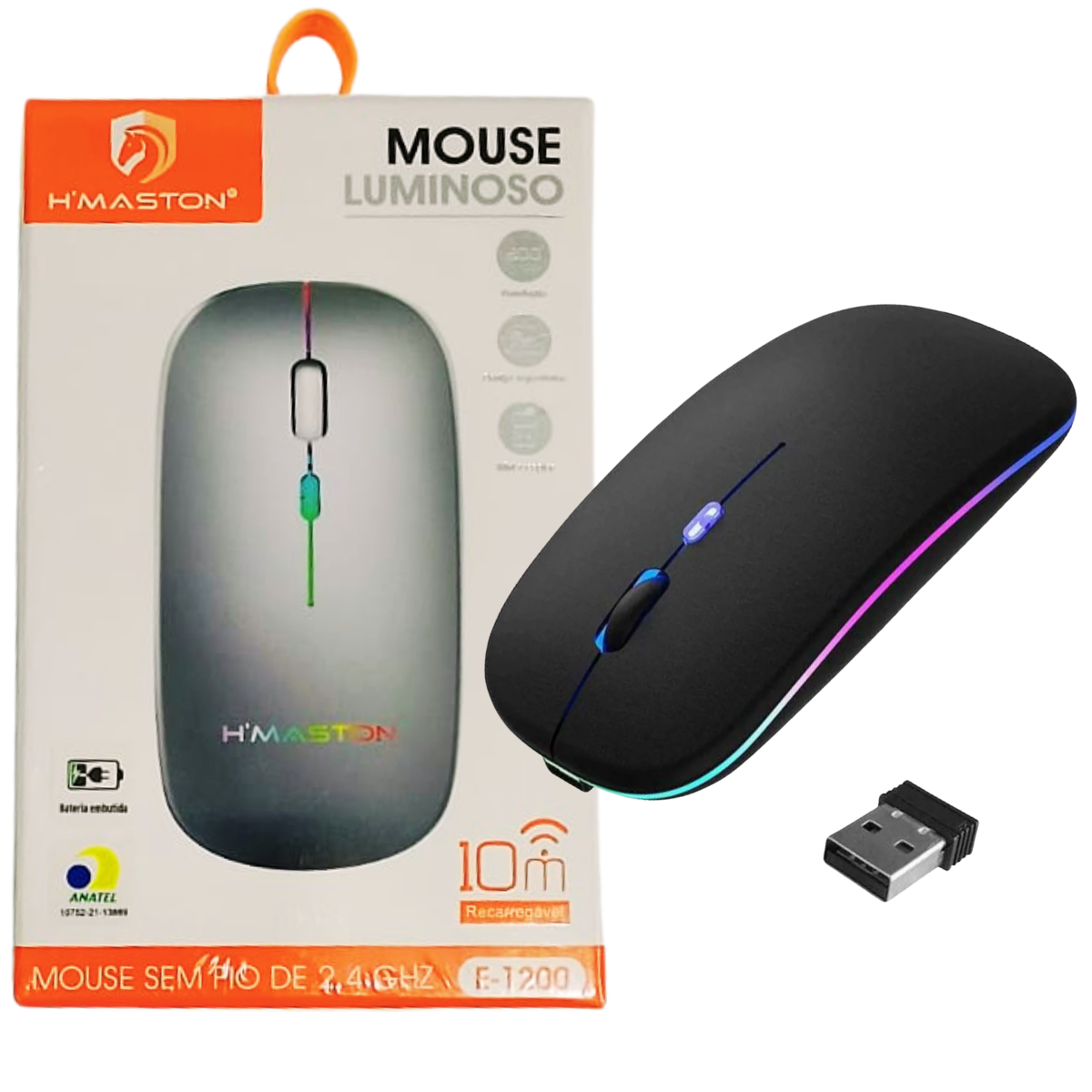 Mouse sem fio recarregável H’maston E-1200 com resolução de 1200 dpi, ideal para quem busca precisão e conforto. Possui design ergonômico, clique silencioso e iluminação RGB, proporcionando uma experiência agradável tanto para uso profissional quanto para lazer. O mini receptor USB 2.4GHz garante conexão estável com alcance de até 10 metros. Leve e compacto, é fácil de transportar e oferece alta precisão nos movimentos. Conta com bateria recarregável embutida, eliminando a necessidade de pilhas.